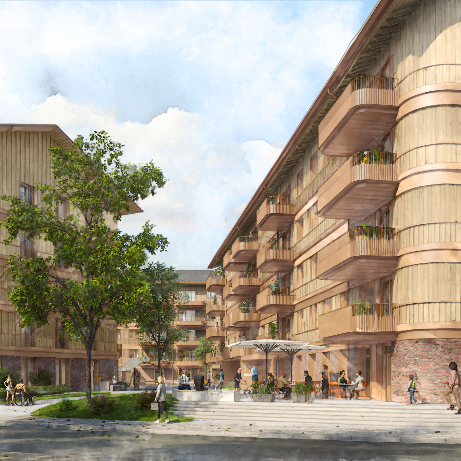 Die drei Wohngebäude werden in Holz‑Hybrid‑Bauweise errichtet – der Baustoff Holz hat ökologische Vorteile und schafft zu dem eine hohe Aufenthaltsqualität.
